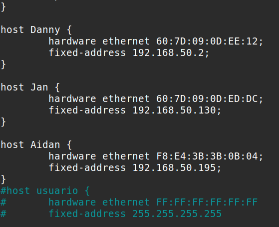 Un cop acabat de copiar la MAC accedim a /etc/dhcp/dhcpd.conf i afegim aquest següent fragment amb el MAC i IP respectivament.