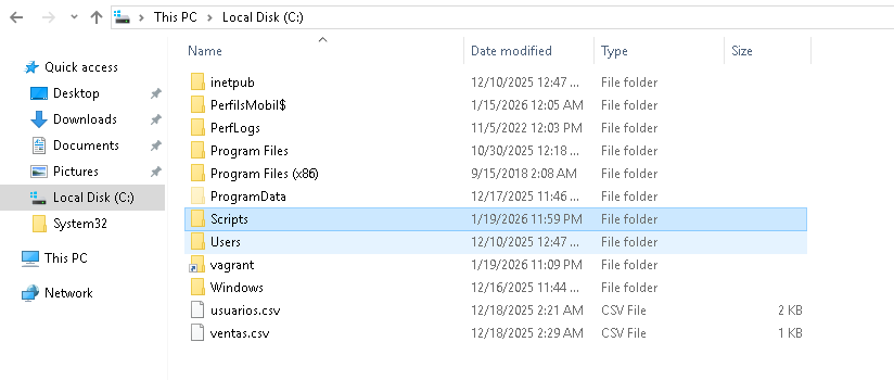Per arribar a poder crear les automatitzacions primer de tot obrirem l’aplicació d’arxius de la màquina virtual. Cliquem el “Local Disk C” i creem la carpeta “Scripts”. Dintre de la carpeta premem el clic dret i cliquem el botó “Text Document” allà dintre ja posem el nostre script i el guardem posant darrere del nom “.ps1”