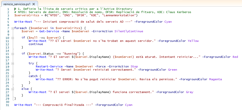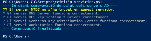 Continuarem utilitzant aquest altre script que consta en comprovar si els serveis essencials estan actius, continua reiniciant els serveis del Active Directory i després fa un informe.