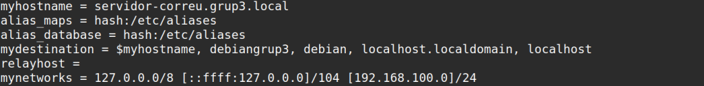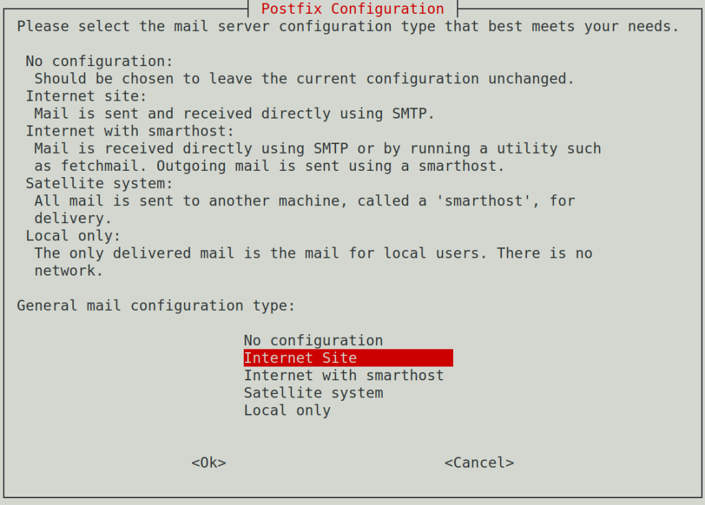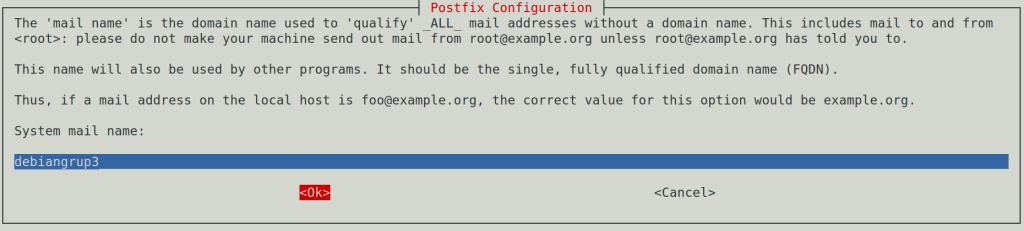 I un cop actualitzat continuem amb la instal·lació del Postfix amb aquesta altre comanda: “sudo apt install postfix -y” on ens surtira aquesta pantalla on haurem d’agafar la configuració que vulgueu, en el nostre cas decidim agafar l’opció de “Internet Site”