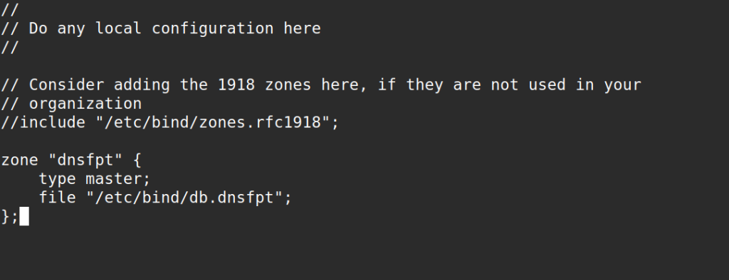 Per començar amb la configuració accedim a l’arxiu “/etc/bind/named.conf.local” des de la màquina virtual on ho farem tot.