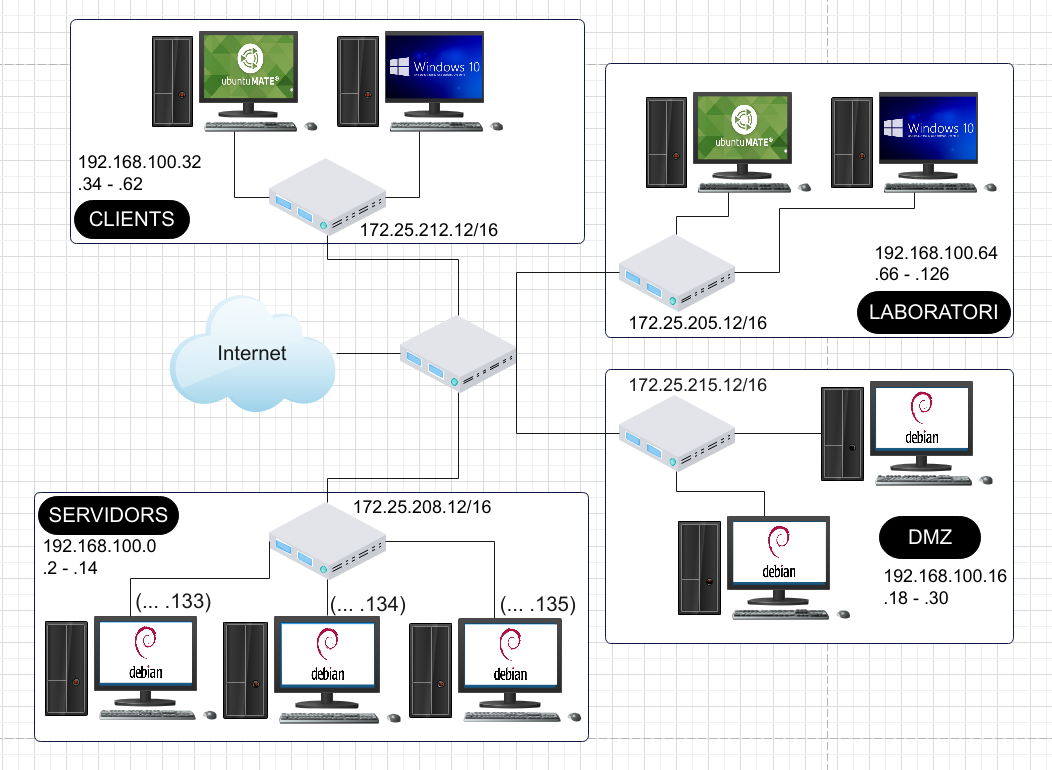Servidors (Alberto), Clients (Jan), DMZ (Izan) i Laboratori (Àdrian)